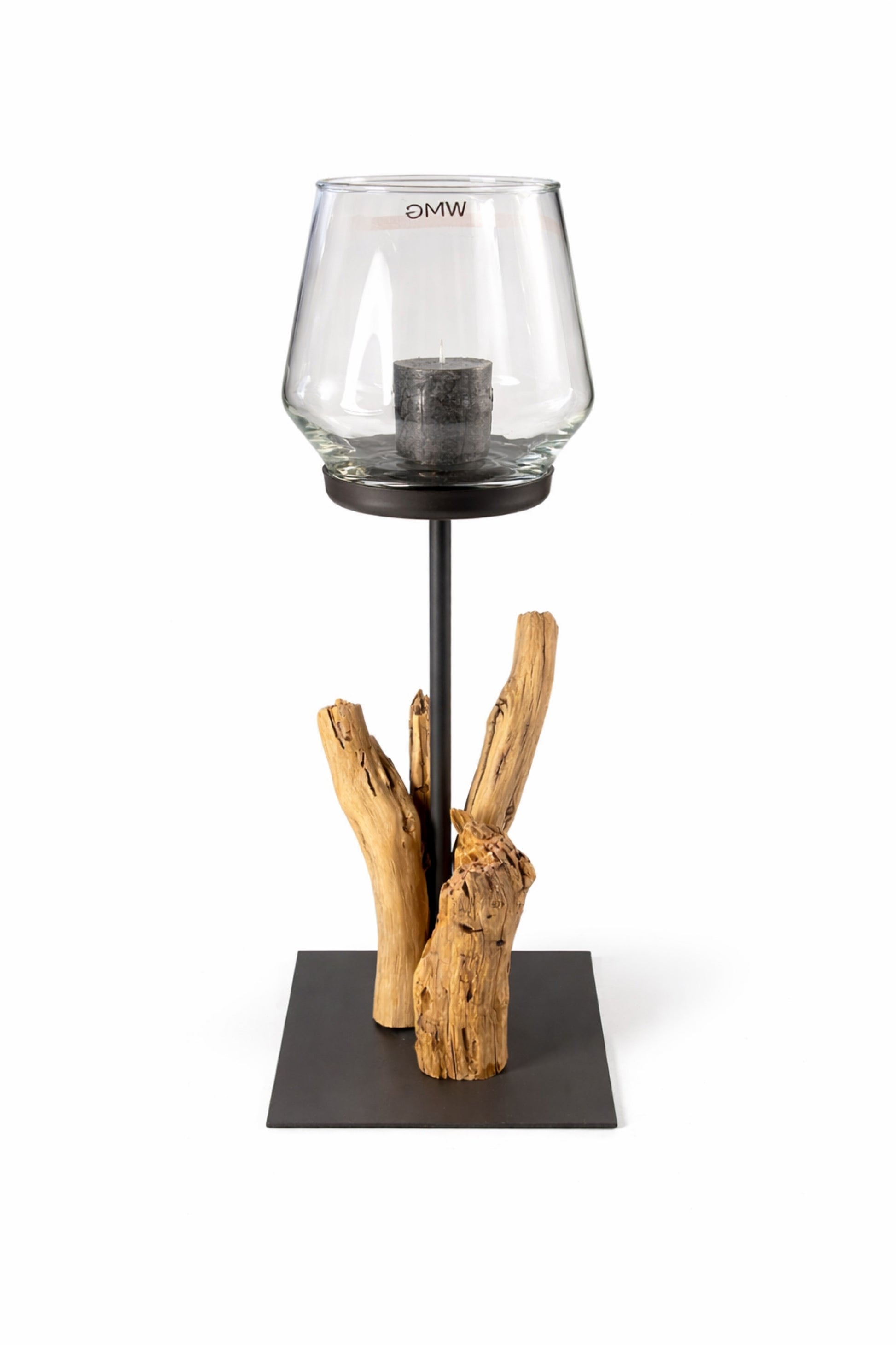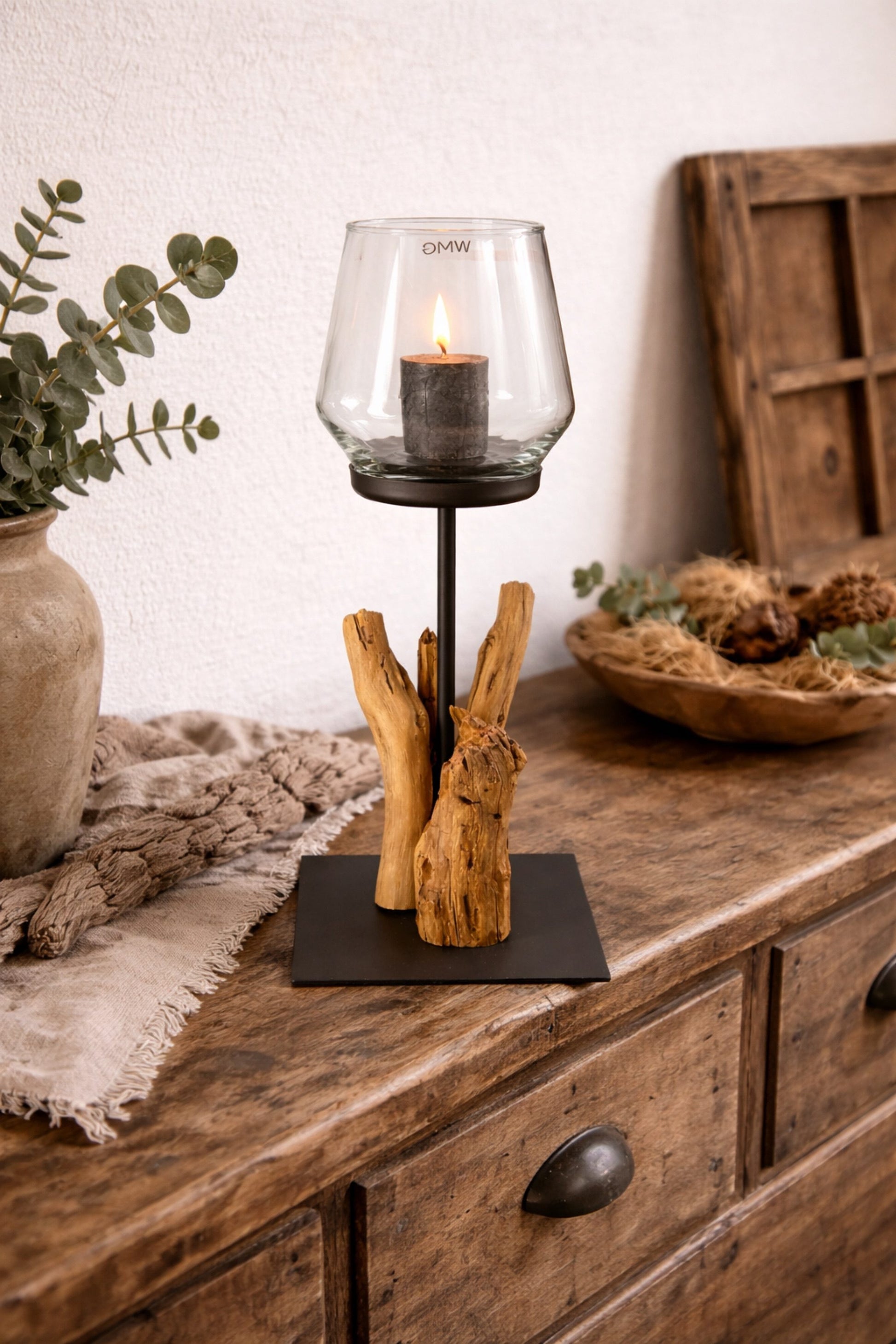 Wunderschönes Metallwindlicht mit Glasaufsatz und Treibholzdekor