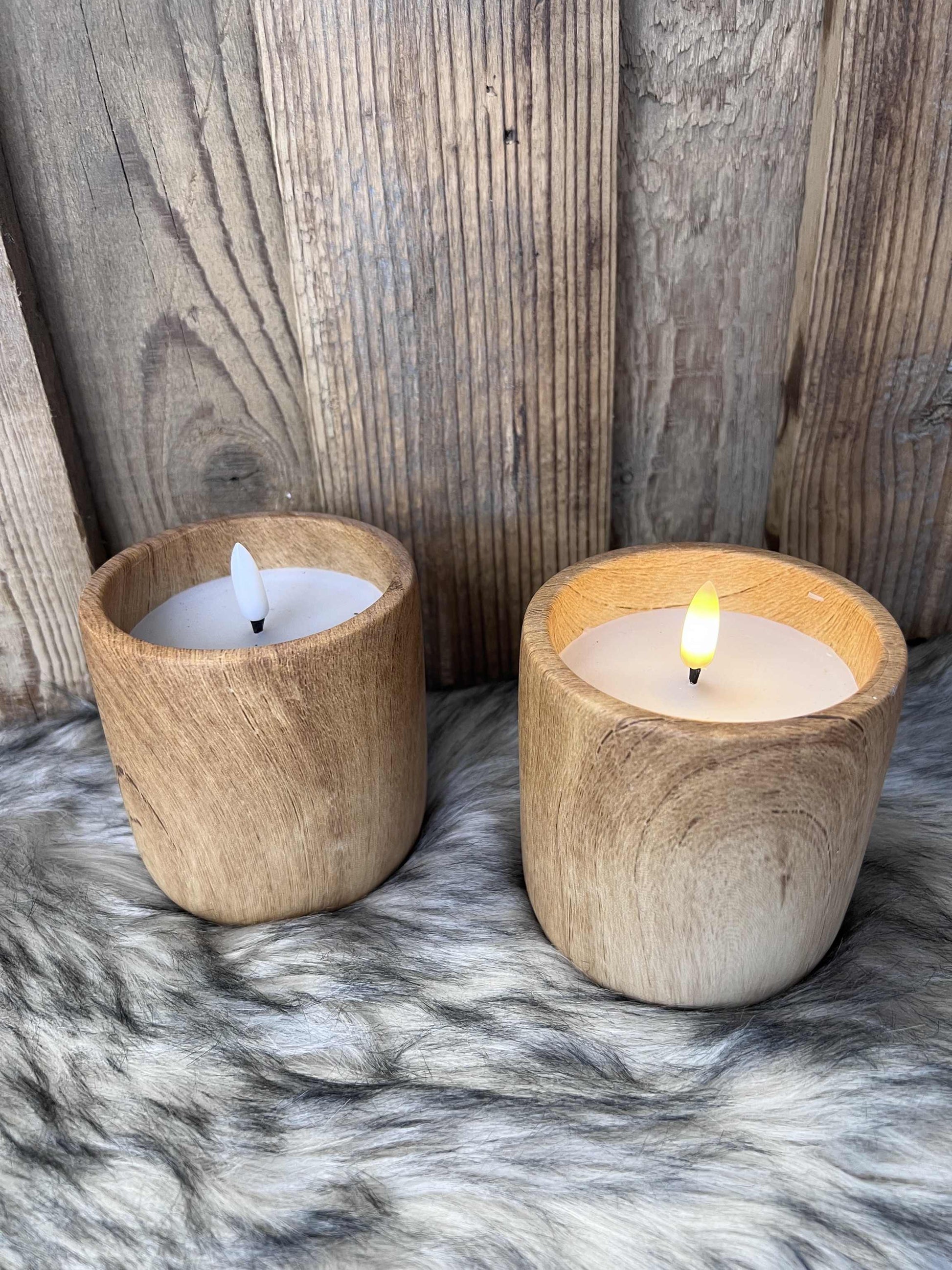 Täuschend echt wirkende Kerze aus Echtwachs in Holzoptik.