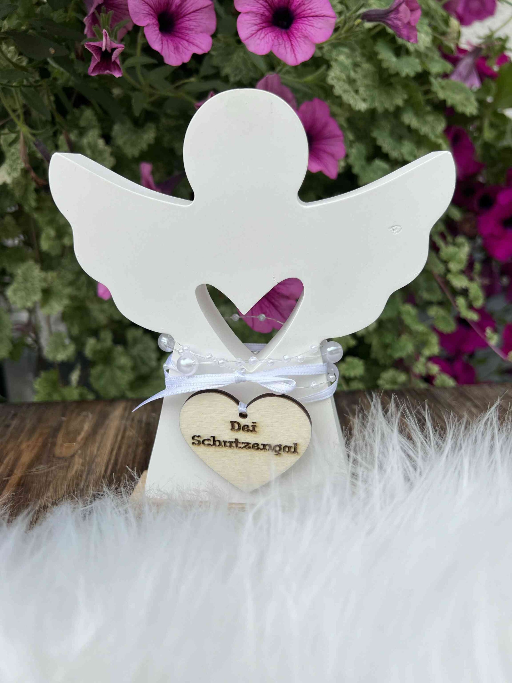 Liebevoll gestalteter Schutzengel aus Bastelbeton mit Herzanhänger.