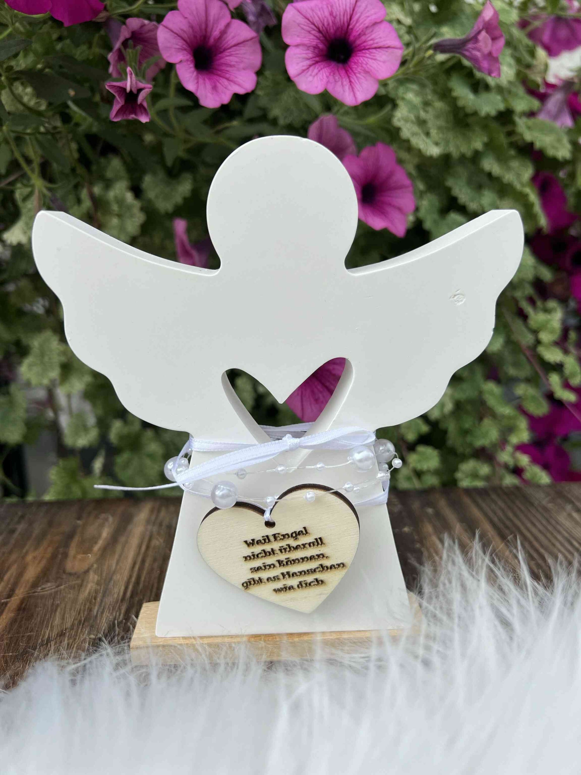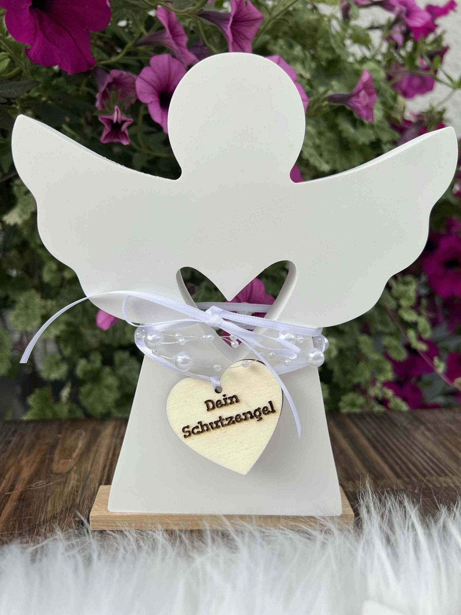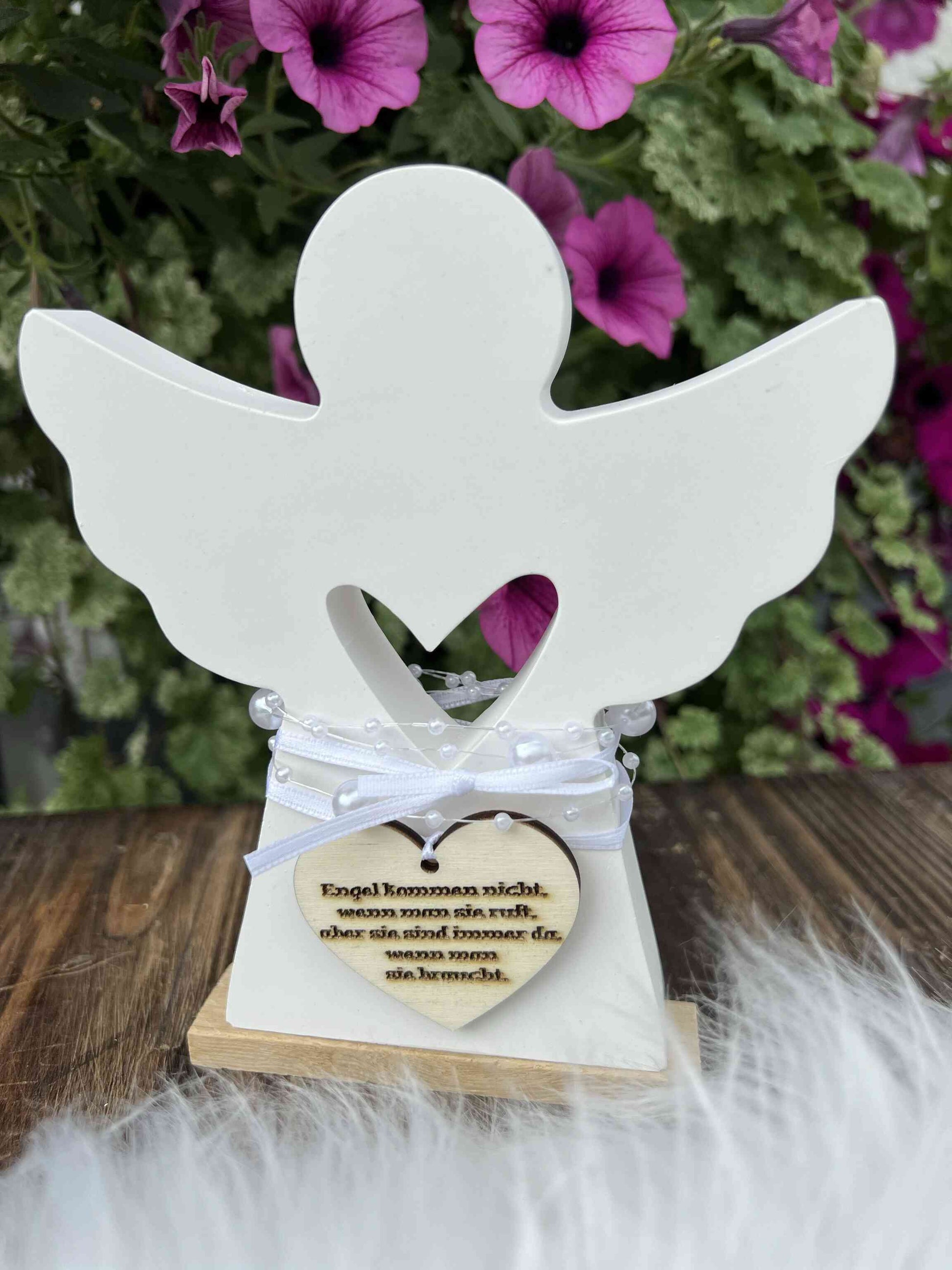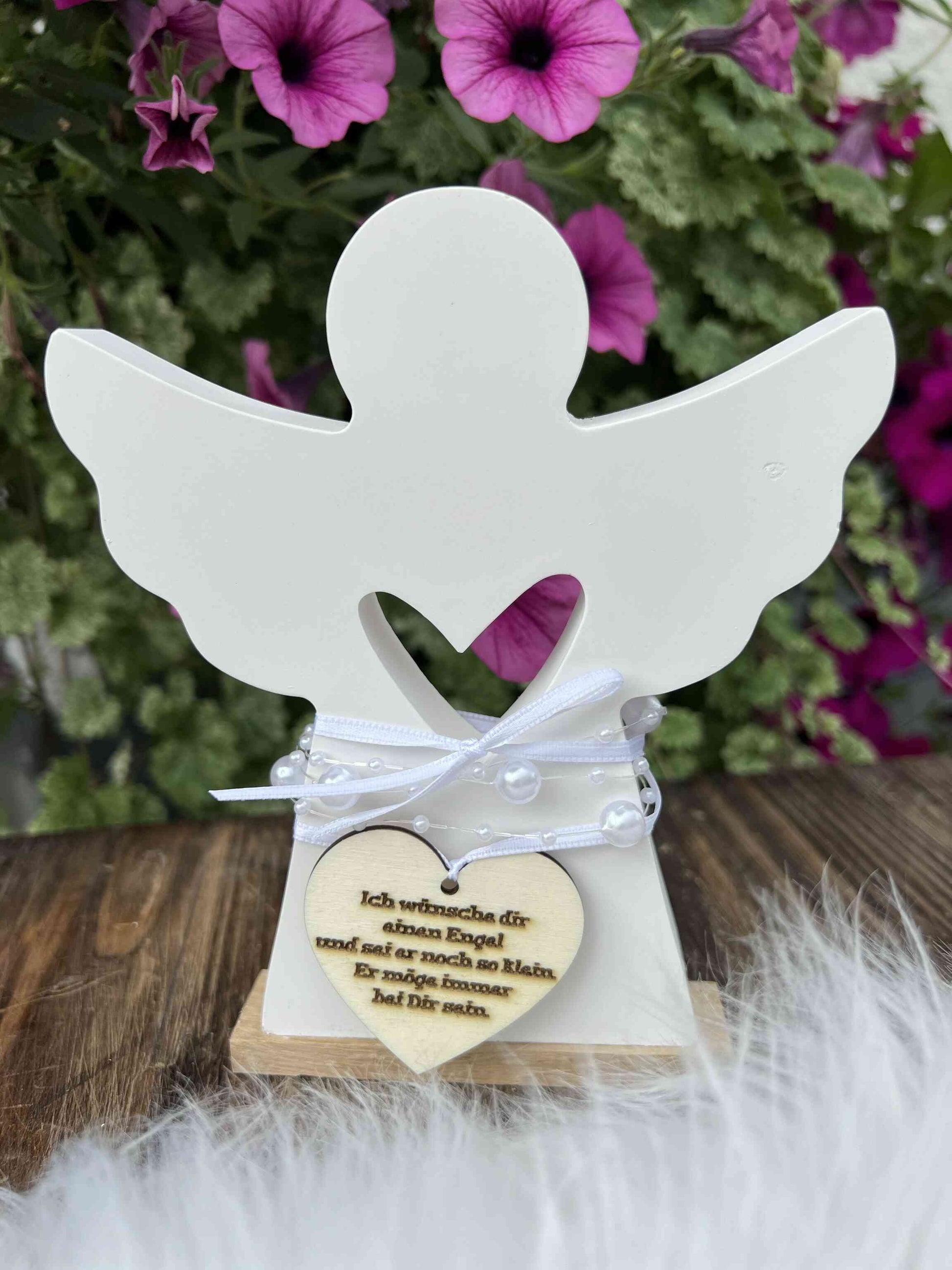 Liebevoll gestalteter Schutzengel aus Bastelbeton mit Herzanhänger.